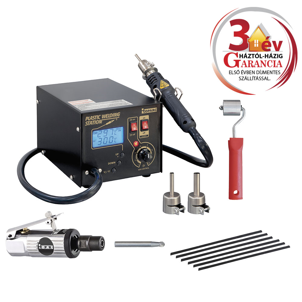 A könnyen használható forrólevegős műanyag hegesztőállomás (2 db fúvókával Ø 5 mm + Ø 8 mm) a járművek műanyag alkatrészeinek hegesztésére szolgál. Az állítható, széles hőmérséklet-tartomány (160-480°C) a műanyagok hőmérsékletét olvadáspontjukig emeli, így azok puhává és könnyen javíthatóvá válnak. A levegő áramlási sebessége állítható, a műanyag homogén összeolvadásának fenntartása érdekében.