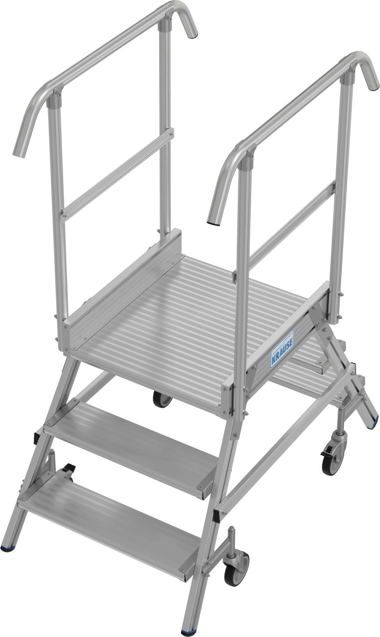 Két oldalon járható gurítható alumínium dobogó mély lépcsőfokokkal és nagy állófelülettel a biztonságos és kényelmes munkavégzés érdekében.