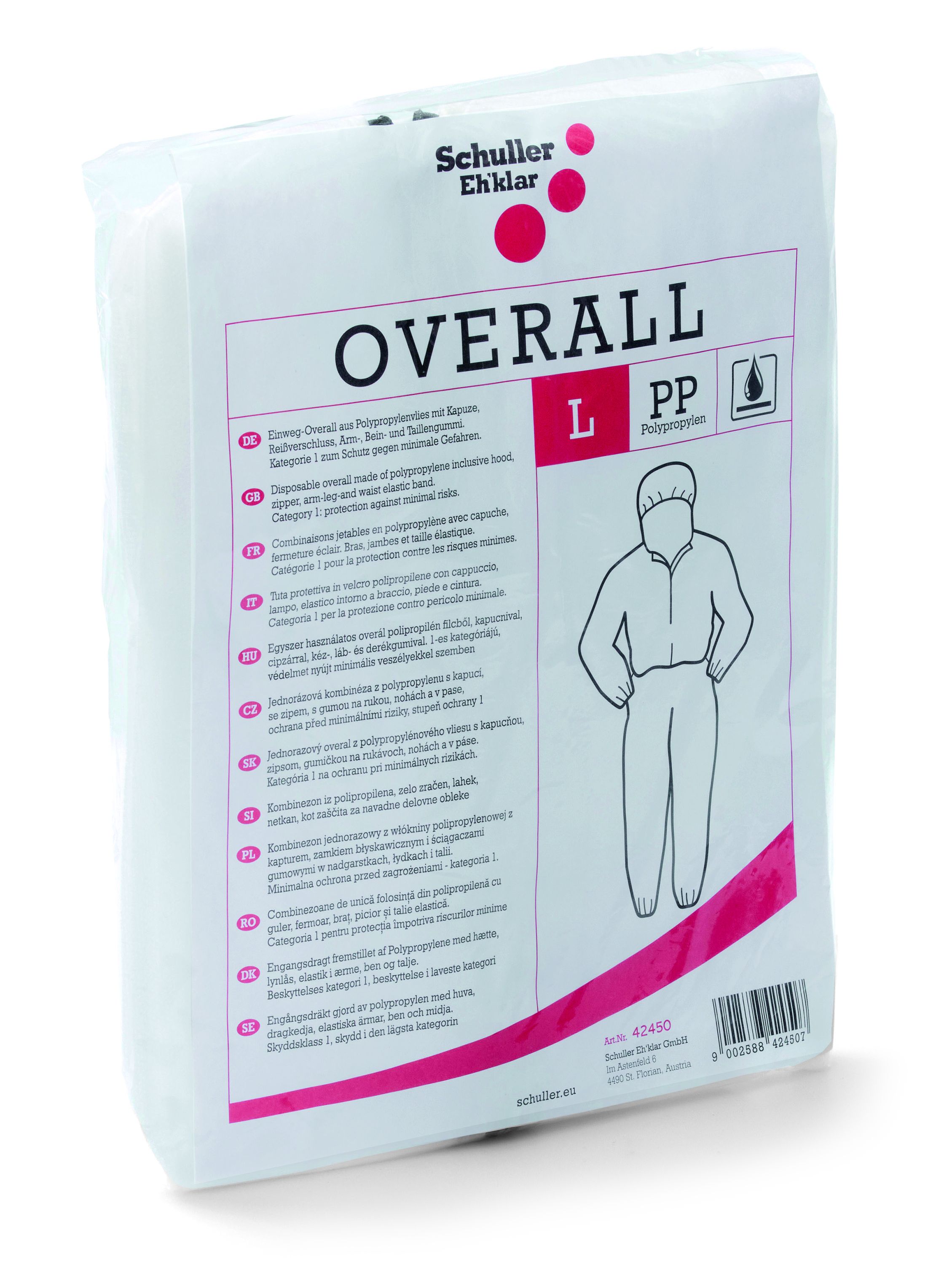 Egyszer használatos overál polipropilén filcből, kapucnival, cipzárral, kéz-, láb- és derékgumival.